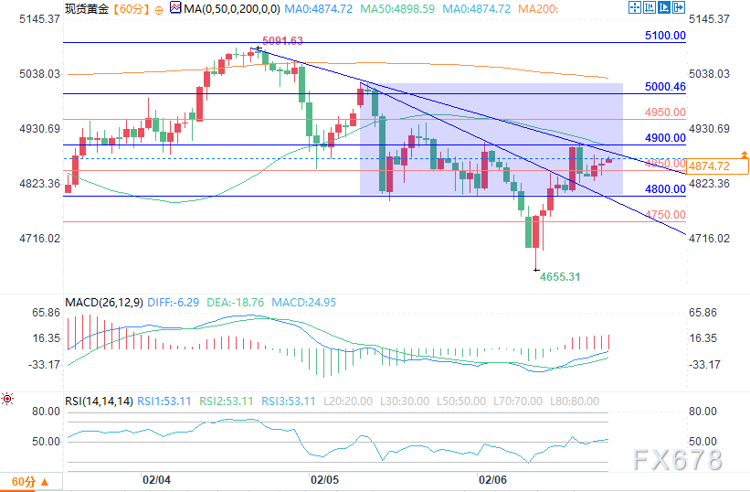 但对于交易策略制定而言,单纯的基本面博弈并无太多实际参考价值,此时技术面与行情结构的指引作用将凸显。目前金价的运行仍高度贴合关键心理关口,上述下降三角形形态的支撑位正落在4800美元。此前金价在测试5000美元关口前,曾以4900美元为支撑,而多头最终也正是在5000美元这一关键心理关口遇阻回落。