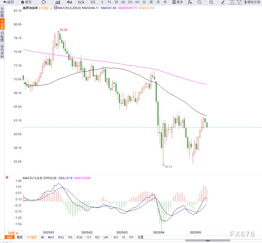 美国石油协会(API)周二公布的行业数据也显示,上周美国原油库存增加了430万桶,这一数字甚至超过了EIA的数据,进一步支持了供应压力上升的判断。   OPEC+持续增产但预期有所修正   尽管OPEC+维持增产节奏,但其在最新月度报告中下调了对今年非OPEC+产油国(如美国)原油供应增长的预期。这一调整反映出OPEC+对供应前景的谨慎态度。   “OPEC+的最新预测显示,即使集团自身维持增产力度,也不能忽视外围供应的不确定性。”——市场观察人士指出   从技术面来看,美原油(WTI)日线图上,价格自5月初以来持续走弱,目前已跌破短期均线支撑,呈现出明显的空头排列形态。K线连续录得阴线,并伴随放量下跌,表明市场抛压加剧。   MACD指标死叉向下,动能柱持续扩大,显示下行动能增强。目前价格逼近60美元整数关口,若该支撑位失守,或将打开下探至58美元附近的空间;   上方初步阻力位则位于63.5美元附近,需站稳该位方可缓解下行压力。整体来看,短期趋势偏空,需警惕进一步下跌风险。