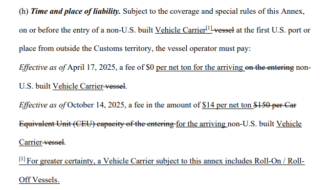 另一方面,原定于自10月14日起生效的船舶停靠费也得到调整。该办公室原计划对每艘非美国制造的船舶,包括运输车辆的滚装船(RoRo),收费150美元/吨,现在,收费大幅降低至14美元/吨。