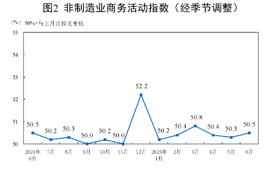 6月份,非制造业商务活动指数为50.5%,比上月上升0.2个百分点,非制造业总体继续保持扩张。