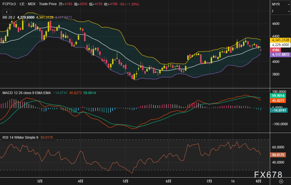 VT外汇官网——周一(8月4日),马来西亚衍生品交易所(BMD)棕榈油主力合约FCPOc3收跌1.39%,报4186林吉特/吨,盘中技术指标呈现多空交织态势:布林带(20,2)中轨位于4341林吉特,而RSI(14)暂稳于50.01中性区间。市场情绪明显受到基本面利空主导,尤其是库存持续累积与产量回升的预期,叠加外围油脂市场疲软,共同压制价格表现。