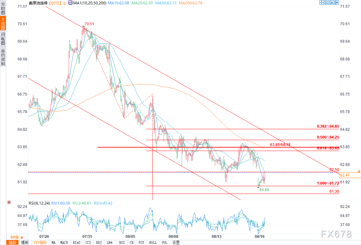 周一(8月18日),WTI原油在分时图上围绕62美元震荡,整体处于短期波动状态。短期看空趋势未完全消除。